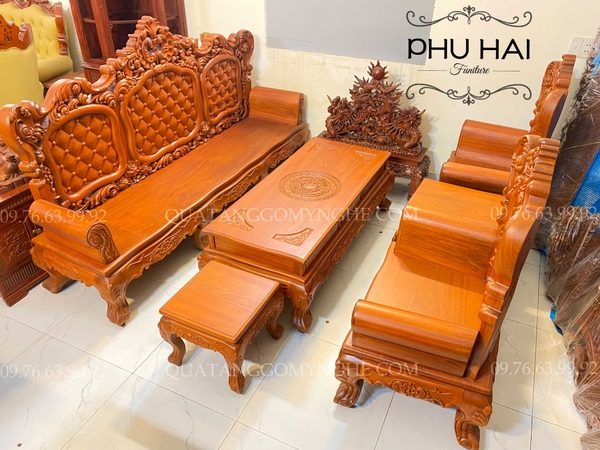 Là mẫu bộ bàn ghế hoàng gia được làm 100% từ gỗ gõ đỏ mặt liền nguyên tấm bao gốm 6 món tiêu chuẩn ngoài ra chúng ta có thể thiết kế sản xuất 6 8 10 món tùy theo nhu cầu cũng như không gian phòng khách sử dụng mà quý khách đặt hàng theo yêu cầu .
