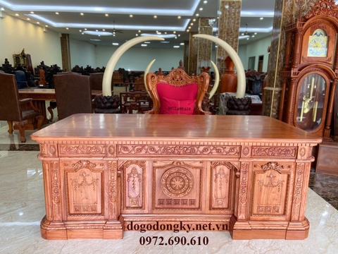 Là mẫu bàn làm việc gỗ tự nhiên được chạm khắc trống đồng từ các loại gỗ quý , với lối thiết kế đậm chất truyền thống Việt Nam . Phía trước nhìn vào là hoa văn trống đồng vô cùng bắt mắt , đối xứng hai bên là các viền hoa văn trang trí tạo nên nét độc đáo chỉ dành riêng cho thị trường việt nam .