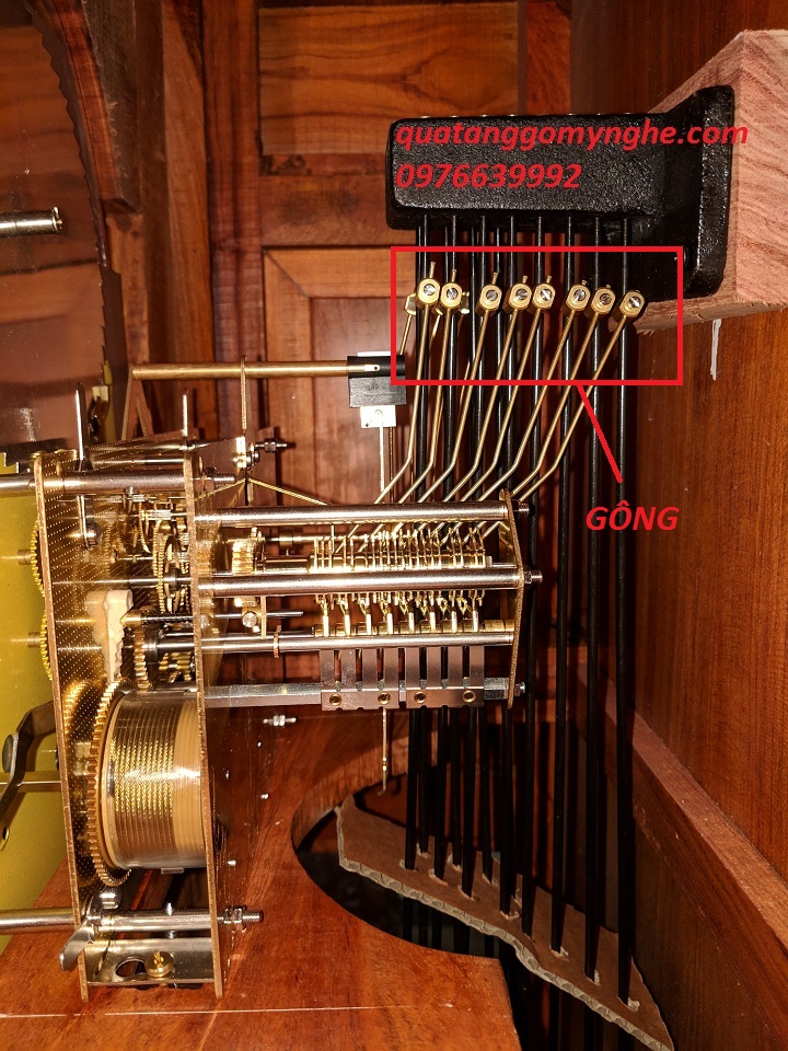_Ý nghĩa của gông trong đồng hồ là gì: Bạn thường nghe máy đồng hồ quả lắc có 6 gông, 8 gông, 12 gông ,16 gông nhưng ko hiểu gông là gì thì gông chính là búa gõ tương ứng với những thanh kim loại sẽ tạo ra những âm thanh nhạc chuông và chuông báo theo giờ , 6 gông thì có 6 búa 6 thanh kim loại, 8 gông thì có 8 búa và 8 thanh kim loại...., nhiều gông hơn thì nhạc chuông sẽ đa dạng hơn và tiếng gõ sẽ lớn hơn.